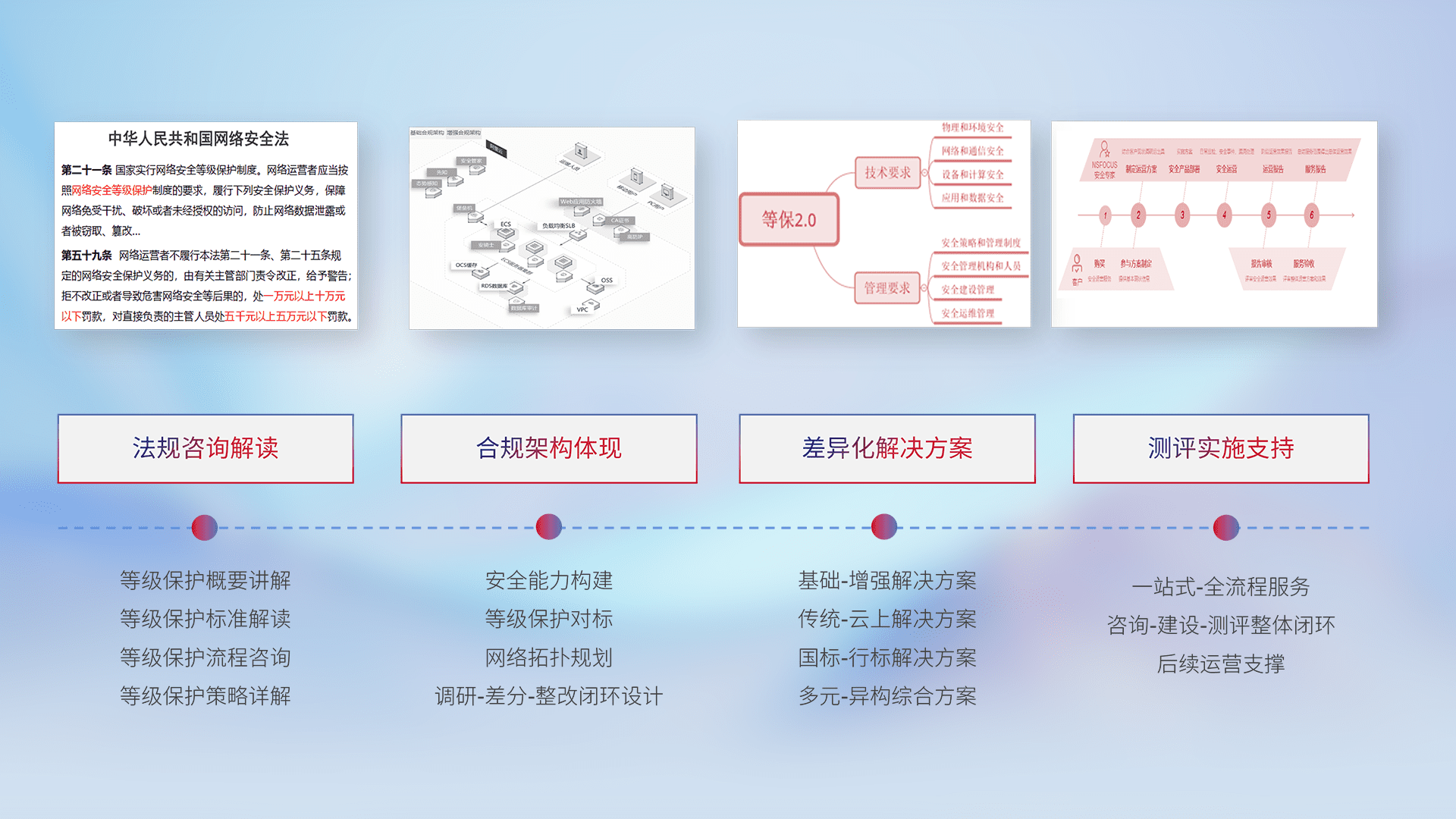 通过专业的法律咨询解读、、合规架构体现、、、差异化解决方案、、测试实施支持等服务,,为客户量身打造等保合规体系。。