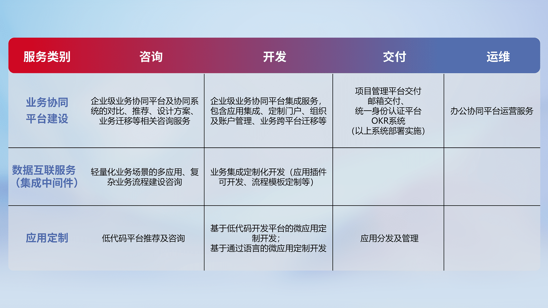 针对钉钉、、企微、、、IDaas等平台级产品提供产品的规划、、、方案、、、交付、、定制化开发等服务,,,,实现如统一协同办公、、、、智能客户服务、、混合会议管理、、、、智能数据查询、、、、等业务场景,,,,实现数字化转型。。